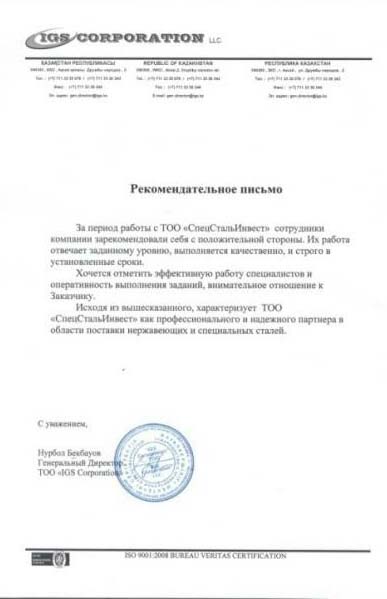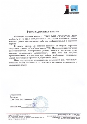 Исходя из вышесказанного, характеризует ТОО “СпецСтальИнвест” как профессионального и надежного партнера в области поставки нержавеющих и специальных сталей.