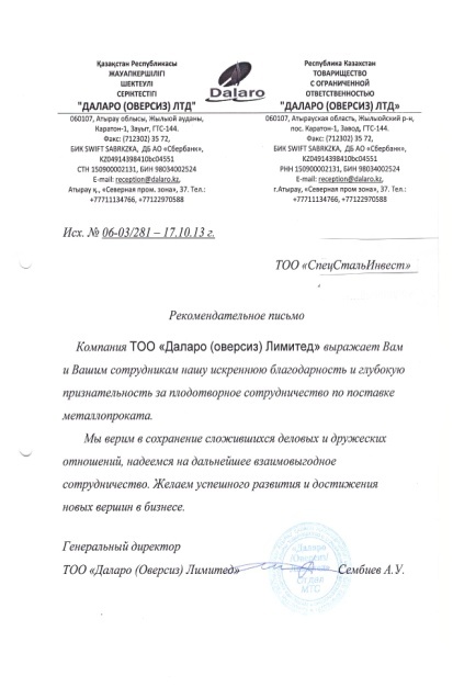 За период работы с ТОО “СпецСтальИнвест” сотрудники компании зарекомендовали себя с положительной стороны. Их работа отвечает заданному уровню, выполняется качественно, и строго в установленные сроки.